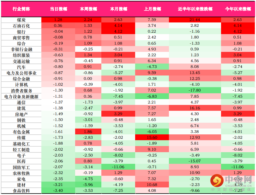 当日煤炭行业领涨,其子行业煤炭开采洗选涨幅达1.85%。煤炭价格方面,动力煤价格有小幅反弹。