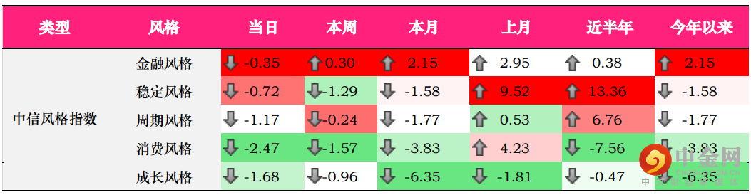 中信风格方面,受白酒股走弱的影响,消费风格当日跌2.47%;成长风格也再次回调;相较于其他风格,以防守为主的金融、稳定风格表现稍有优势,但仍有小幅下跌。