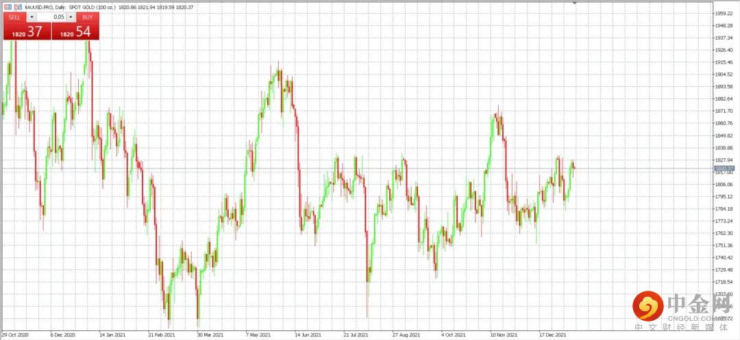 周四(1月13日),现货黄金结束四连涨,日内一度逼近1810美元关口,随后有所反弹,最终收跌0.16%,报1822.47美元/盎司。