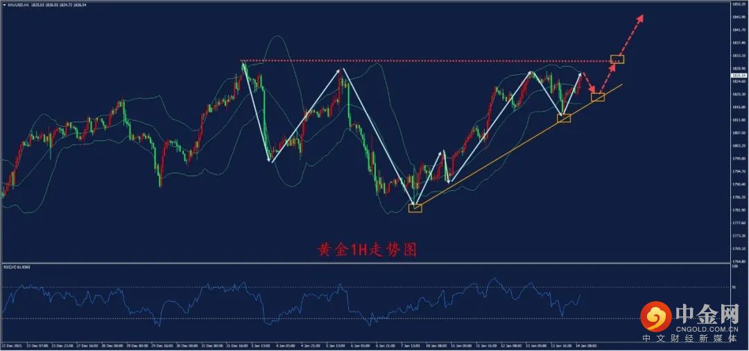 从黄金1小时周期图来看,自1782低点反弹以来,高低点逐步抬高,且价格维持在布林中轨上方运行,表明行情呈现多头走势,上方关注1831的前高压力,上破后有望进一步看涨至1840压力,下方关注1819的低点支撑,该位置同时也是上升支撑线支撑,可作为多单入场点;从RSI指标上看,RSI技术指标在30.0附近触底反弹,表明短线多头动能增强,日内可以采取逢低接多操作。
