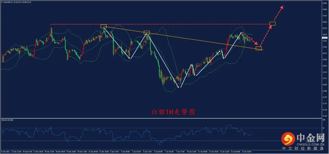 从白银1小时周期图来看,白银自21.93低点反弹以来走出高低点逐步抬高的看涨走势,且价格上破下降趋势线的压制,表明行情由空转多的概率增大,下方关注22.90附近的压力支撑转换位,企稳后,进一步看涨至23.42前高压力的概率增大,突破后,有望进一步看涨至23.90压力附近;从RSI指标上看,RSI技术指标在50.0附近企稳,并重新向上,表明多头动能增强,日内可以等待逢低做多操作机会。