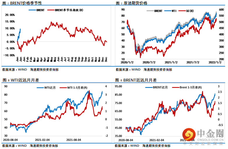 基于供需局面再度紧张,现货市场走强明显,美国能源信息署(EIA)在2022年1月短期能源展望中也对供需数据进行了大幅调整。EIA上调了对2022年原油需求的预期,预计全球原油需求增速为362万桶/日,此前预计为355万桶/日。EIA大幅上调2022年美国原油需求增速至84万桶/日,此前为70万桶/日。EIA预测2022年OPEC原油平均产量将增加250万桶/天,至2880万桶/天。EIA将美国原油产量增长下调了5万桶/日,认为2022年美国原油产量增长60万桶/日,至1180万桶/日,上一期展望中是1185万桶/日。不过,EIA预计2023年美国原油产量将增加61万桶/日,至1241万桶/日,这将超过2019年创下的1230万桶/日的纪录。该机构表示,从2021年最后三个月开始,美国石油产量预计将连续九个季度增长。不过,2022年的供需判断显然让过剩预期回落,EIA判断2022年一季度原油市场大致还是紧平衡,这跟前一周OPEC会议上预测一季度过剩140万桶/日,以及国际能源署(IEA)上个月预测过剩170万桶/日形成了巨大的差异,也说明这段时间发生的事情让原油市场对供需平衡的评估发生了剧烈的变化,原油市场近端供应紧张在油价上也得到了充分体现。不过,EIA预测到二季度之后原油市场开始过剩,全年过剩约50万桶/日。