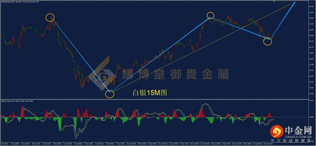 从白银15分钟周期图来看,白银从23.30一线受阻下跌展开震荡后,运行至22.80一线获得支撑,目前在15分钟周期,白银MACD底背离信号出现,预计短期将有机会向上反弹,另外白银上方重要压力可参考向上趋势线突破反压位23.50一线。