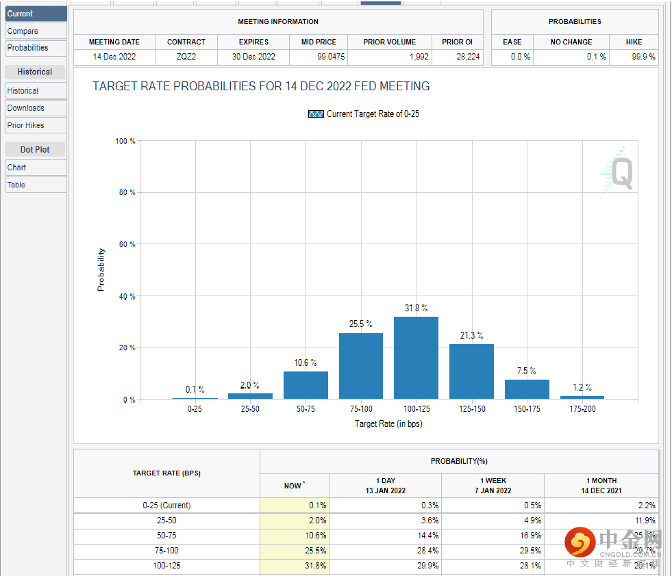 CME FedWatch Tool显示,市场目前因此计入2022年加息4次的前景: