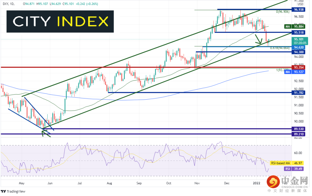 这应该利多美元指数。美元指数已回到2021年5月以来的长期上升通道的下轨趋势线上方,上档阻力有水平阻力位95.52、50天均线95.88。美元指数目前守住2021年10月28日低点到11月24日高点行情的61.8%回档位,即94.66附近,但若下破,可能跌至水平支撑位94.30和93.35。