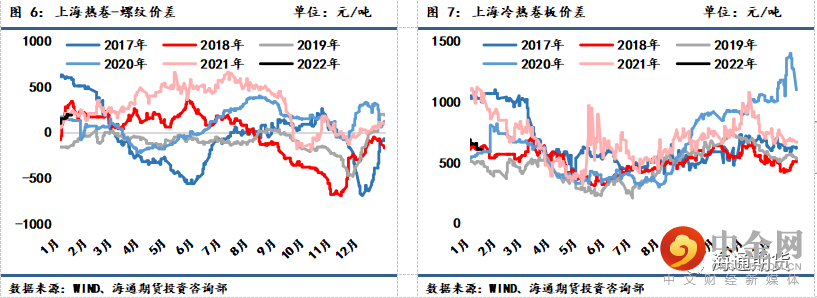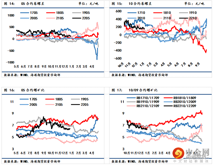 螺纹和热卷05-10月间价差基本维稳。上周热卷盘面价格表现弱于螺纹钢,05合约卷螺差从151收窄至108元/吨;原料铁矿石总体表现弱于成材,05合约螺矿比价从6.29升至6.46。