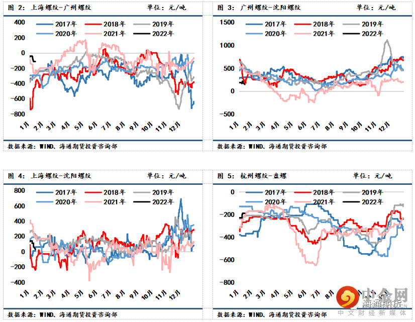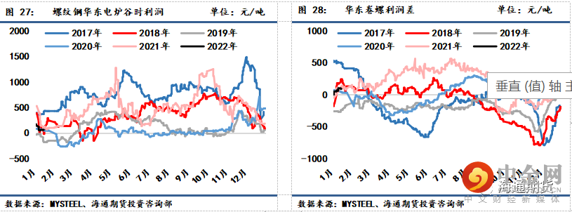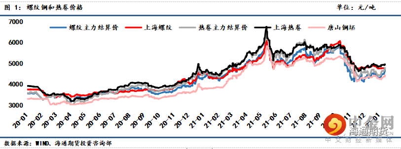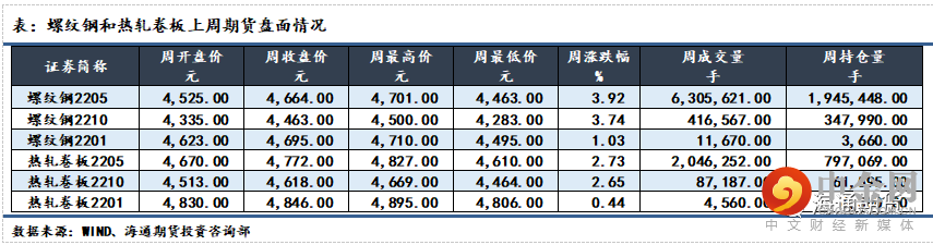 上周成品材期货盘面价格走强后维持高位震荡态势,现货价格涨跌互现。上周螺纹钢2205合约上涨3.92%至4664元/吨,热轧卷板2205合约上涨2.73%至4772元/吨。上周上海螺纹下跌20元/吨至4750元/吨,杭州螺纹下跌20元/吨至4780元/吨,广州螺纹上涨50元/吨至5010元/吨附近,北京螺纹上涨80元/吨至4630元/吨。螺纹华东华南过磅价差降至-113元/吨附近,华南北方过磅价差从187收窄至144元/吨附近。上海热卷上涨10元/吨至4940元/吨,广州热卷上涨60元/吨至4890元/吨,华东卷螺价差从热卷价格高出螺纹160元/吨扩大至190元/吨。