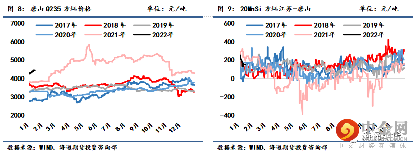 上周各地区钢坯现货价格表现坚挺,唐山方坯Q235上涨50元/吨至4320元/吨,唐山20MnSi上涨50元/吨至4420元/吨,江苏20MnSi上涨80元/吨至4600元/吨,江苏和唐山间价差升至180元/吨。