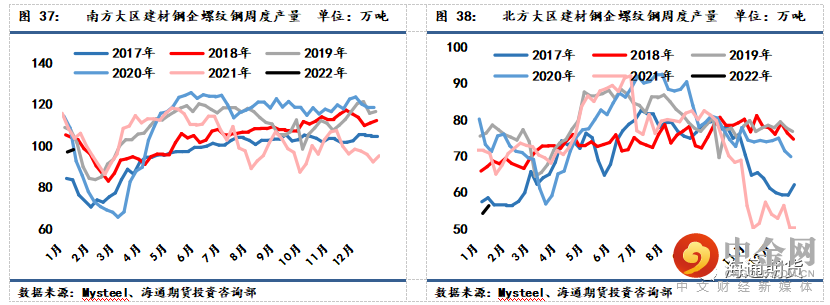 上周螺纹钢产量周环比增加3.86万吨至284.39万吨,同比增速环比前期扩大,同比去年水平减少17.45%,其中长流程产量回升,短流程产量回落。分地区来看,华东、南方和北方大区产量环比均有回升,但同比仍处低位。