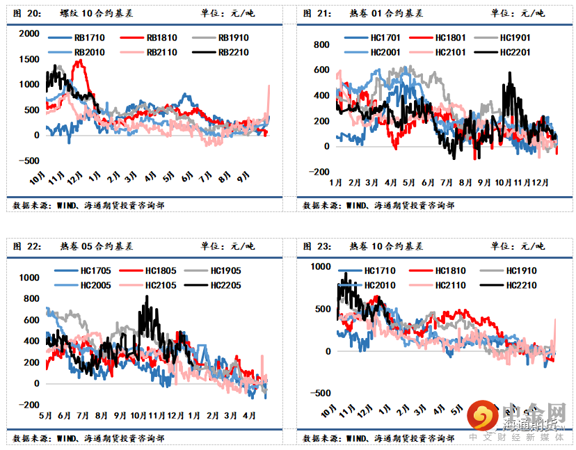 螺纹01合约基差从298缩小至202元/吨,螺纹05合约基差从392缩小至233元/吨,螺纹10合约基差从587缩小至434元/吨。热卷01合约基差从110缩小至94元/吨,热卷05合约基差从253缩小至168元/吨,热卷10合约基差从410缩小至322元/吨。