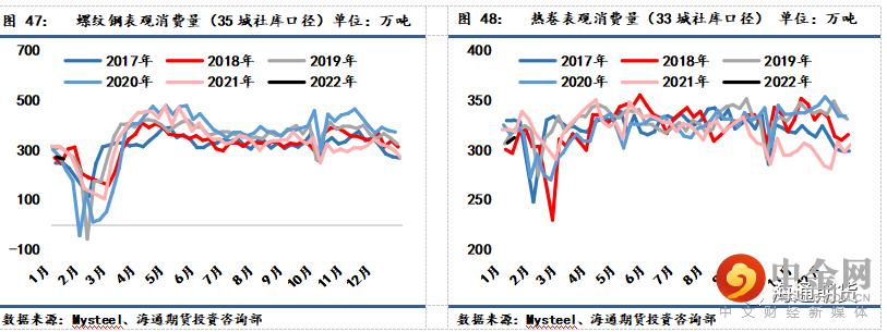 螺纹钢测算周度表观消费量环比减少6.08万吨至264.82万吨,表需同比增速增至-11.54%。热卷表观消费量周环比增加4.54万吨至310.69万吨,表需同比增速增至-1.3%。