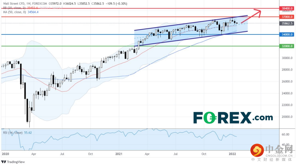 看涨的主要支持位 (即「止损位」) 已调升至34,000点 (水平蓝线),接近50周移动均线。若美股华尔街指数CFD跌回此水平,中期即反转看跌。