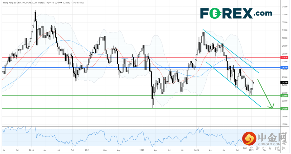 只要恒生指数CFD在主要阻力 (止损) 位26240点之下交投。料将重试22,650点的前低位,甚至下试2020年的低位21,000点。