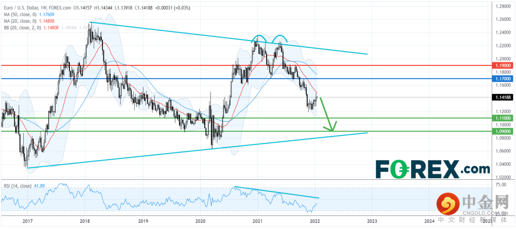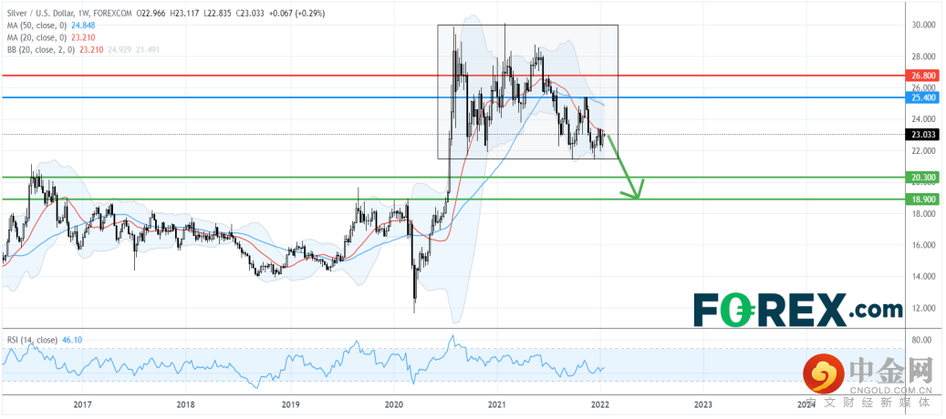 从技术角度看,如周线图所示,现货白银的下行压力逐渐增强。目前,它正在威胁去年8月以来盘整区间,20周移动均线进一步远离50周移动均线。