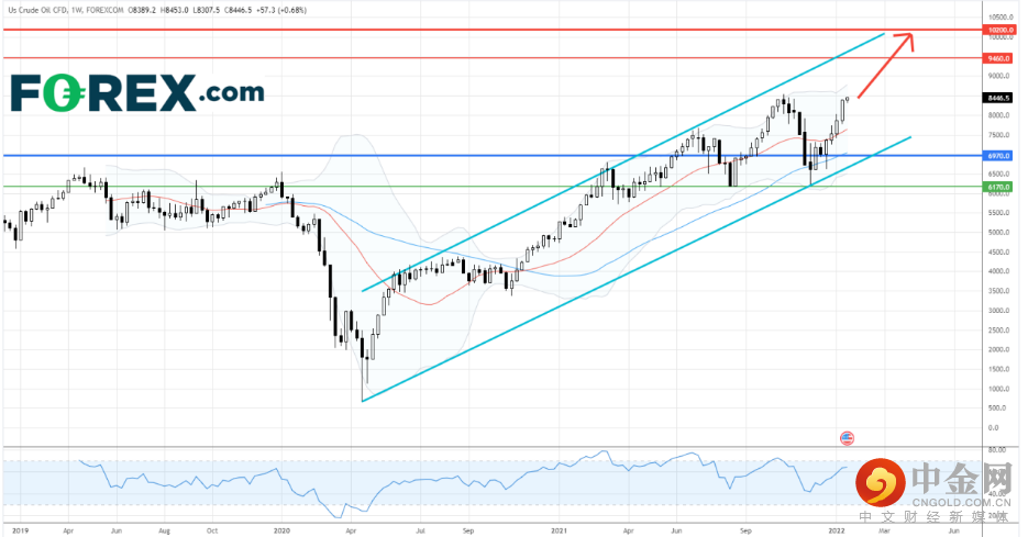 在周线图上,美国原油CFD仍在上升通道之间操作。目前,价格亦企稳在20周和50周均线之上。相对强弱指标亦在60多点,表示上行动能强劲。