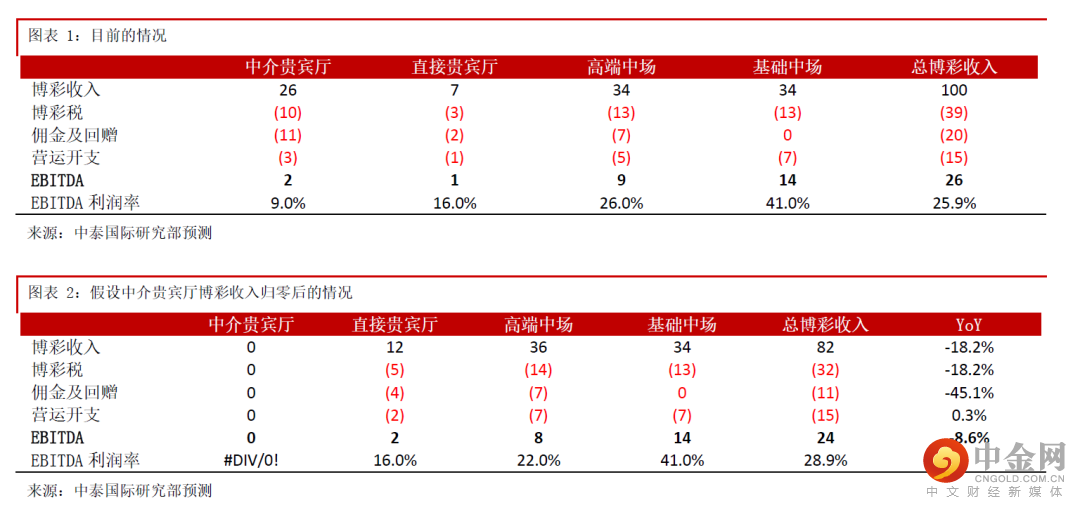 我们估计疫情后贵宾厅收入占比下降至33%左右,当中80%为中介贵宾厅、20%为直接贵宾厅,同时假设高端中场及基础中场各占中场收入的50%,行业的EBITDA利润率约为25.9%。假设未来中介贵宾厅收入归零,而原有20%及30%的中介贵宾厅收入分别流到直接贵宾厅及高端中场;博企承担所有中介贵宾厅的人力成本,估计博彩总收入较原先下跌18.2%,而EBITDA会下降8.6%,行业的EBITDA利润率会提升3个百分点。