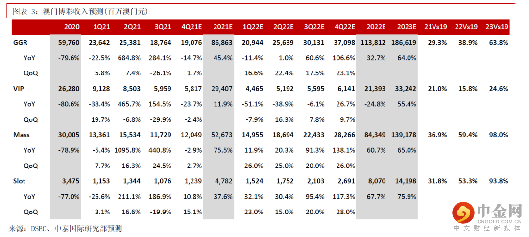 我们认为澳门政府原先对22年博彩收入1,300亿澳门元的预测难以达到。由于内地疫情反复,而且今年有内地多项重要事件举行,动态清零的策略会持续至年底,我们预测22年博彩收入同比+31.0%至仅1,138亿澳门元(恢复至19年的38.9%)。贵宾厅同比-24.8%/中场+60.7%,分别恢复至15.8%/59.4%。预测23年博彩收入为1,866亿元左右,同比+64.0%(恢复至19年同期的63.8%);贵宾厅及中场分别恢复至19年同期的24.6%/98.0%。