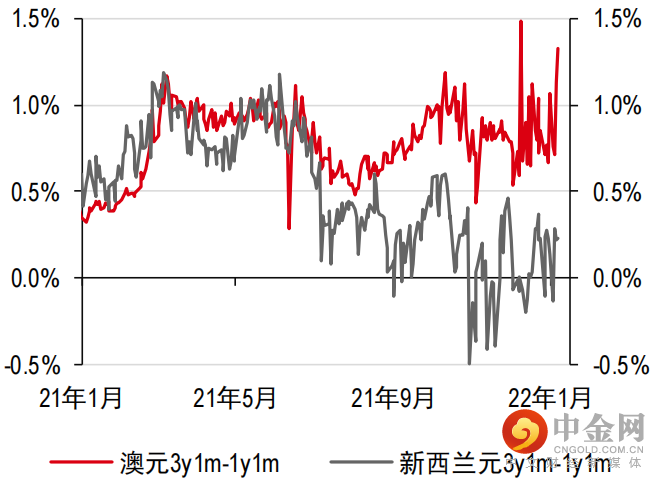 影响澳元走势的主要因素可能是其短期利率上升潜力。与新西兰元不同,澳元短期利率相对于市场对澳大利亚储备银行终端利率的预期仍然较低¹。这是由市场对3年后(2025年)1个月利率与1年后1个月利率的预期之差,即3y1m-1y1m来衡量的(图1)。短期利率仍有空间更好地反映终端利率预期,从而支撑澳元。