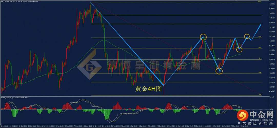 从黄金4小时周期图来看,目前市场处于高位窄幅震荡,整体市场在关注上方1830一线前高的压力,是否能够有效突破成为目前的焦点。从走势上看,中期上涨形态并未改变。而市场近期处于斐波那契回调线50%以及61.8%分位之间震荡,下方可重点关注50%分位的1812附近支撑。