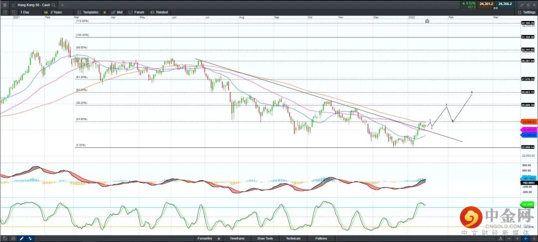 恒生指数自12日以来突破50日均线上行,并且潜在突破自2020年6月28日以来的长期下行趋势线,近期的上行压力集中在100日均线25000整数关口。MACD试图突破0轴上行,若突破则恒指将建立进一步的上行走势,进一步的潜在目标首看25885,然后是26881附近。