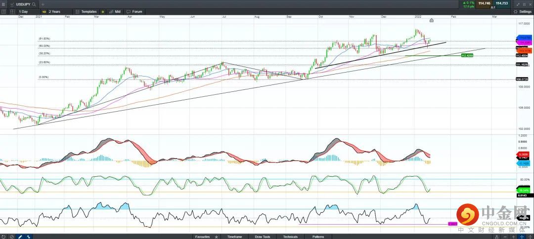 美元兑日元自2021年1月份以来走在长期的上行趋势中,因美联储紧缩货币政策与日本央行长期宽松货币政策的反差影响,有望继续保持上行走势。日内50日均线将为重要潜在支持,支持价格集中在114.20,根据RSI走势看,近期的上行动能仍然有望保持,中期上行潜在目标在118水平。若日本央行意外爆冷释放紧缩信号,有可能引发一轮技术性回撤,潜在的关键支持在112.42-113.18的区间。