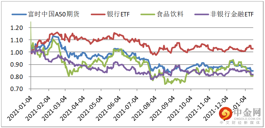 上周,A50在周四周五经历了大跌,三大主要板块集体下跌。银行板块下跌0.8%,非银金融下跌3.0%,食品饮料下跌4.9%,A50期货2201合约下跌1.9%。