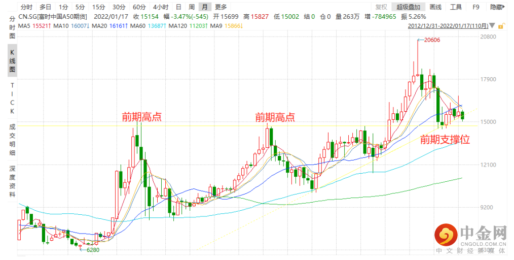 从技术分析来看,A50处于月线支撑位,也就是前期的高点,关注该点位能否反弹。支撑点位:15000。今天最低点到15002后触底反弹,如果在15000点没有破位,A50大概率将筑底反弹。