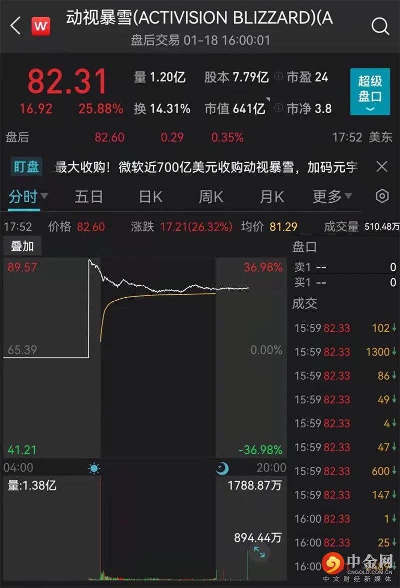 受次利好消息提振,动视暴雪盘前大涨37%,截至收盘价格为82.31美元,收涨25.88%。