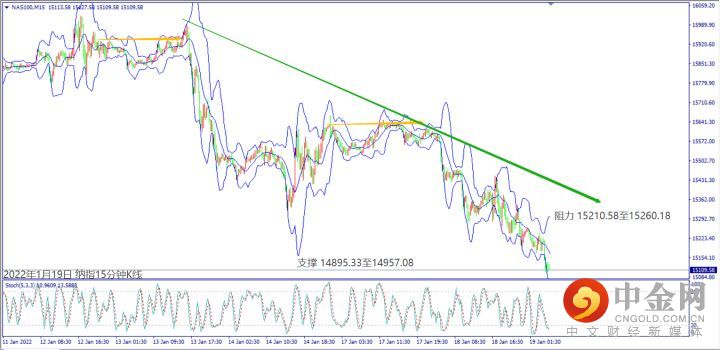 日级别线图,连续下跌再创波段新低,移动均线出现空方排列,可能延续跌势;15分钟K线,短线形成盘跌,下降趋势线冲不过,大有可能下探支撑。