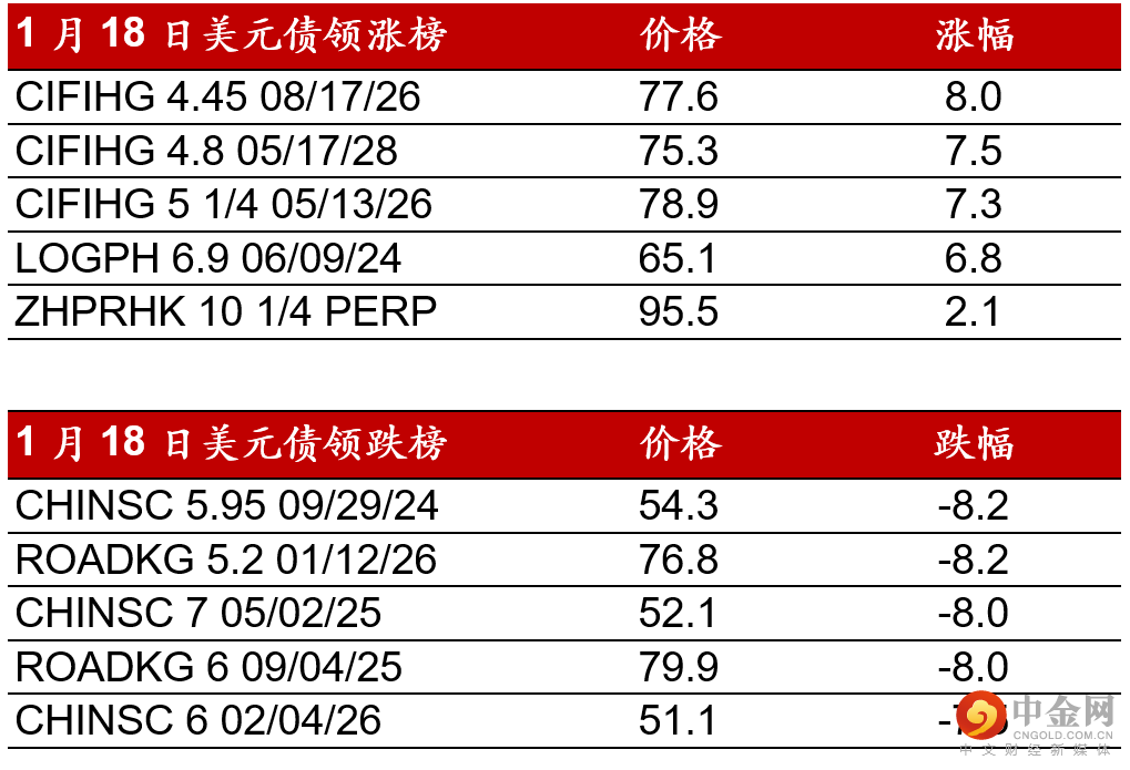 昨日(1月18日),高收益地产板块整体小幅反弹,市场买入情绪有所回升。碧桂园债券早上走高5-6pts,午后稍微回撤1pt。其他评级较高的债券如旭辉/龙光地产债券也反弹4-7pts。新城发展/宝龙等债券见少量买入需求,日内上升1-3pts。其他地产债券如融创/世茂/合景泰富收盘小幅走高1-2pts,弘阳/华南城/雅居乐永续债则持续下行趋势,下跌1-3pts不等。工业板块债券包括复星国际/中国宏桥等出现少量市场买入兴趣,债券价格小幅升高。