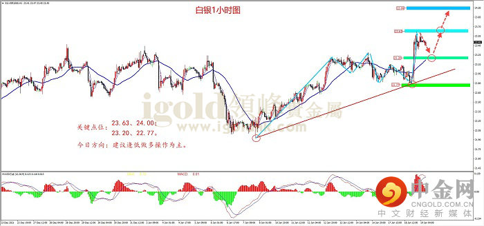 从上图白银1小时图来看,白银自21.93低点反弹以来,走出高低点逐步抬高的上升形态,且价格维持在MA30均线上方运行,表明行情呈现多头走势,日内关注23.20的MA30均线附近支撑,该位置是较好的多头入场点,上方关注23.63的前高压力,上破后进一步看涨至24.00的概率增大;结合MACD指标来看,DIFF与DEA金叉,但多头动能柱逐步缩短,表明短线存在回调机会,可以等待低多机会,故日内操作建议以回落做多为主。