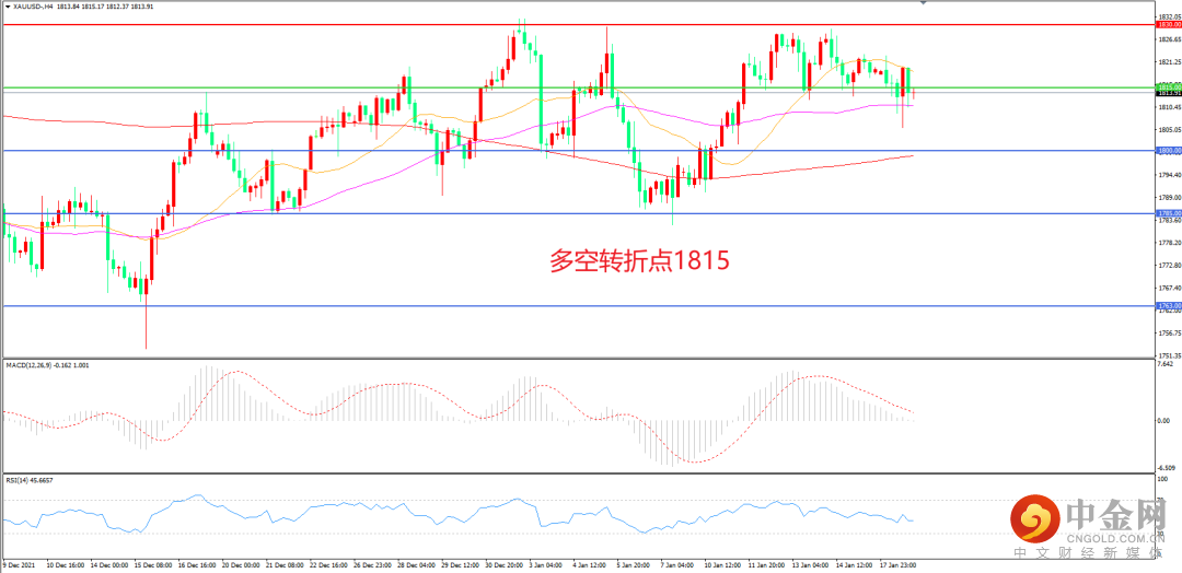 4小时图看,金价以1815为重心展开震荡,55中期均线成为短期支撑,行情高点逐步降低 MACD红柱缩短,RSI指标走平,日内延续震荡概率较大。