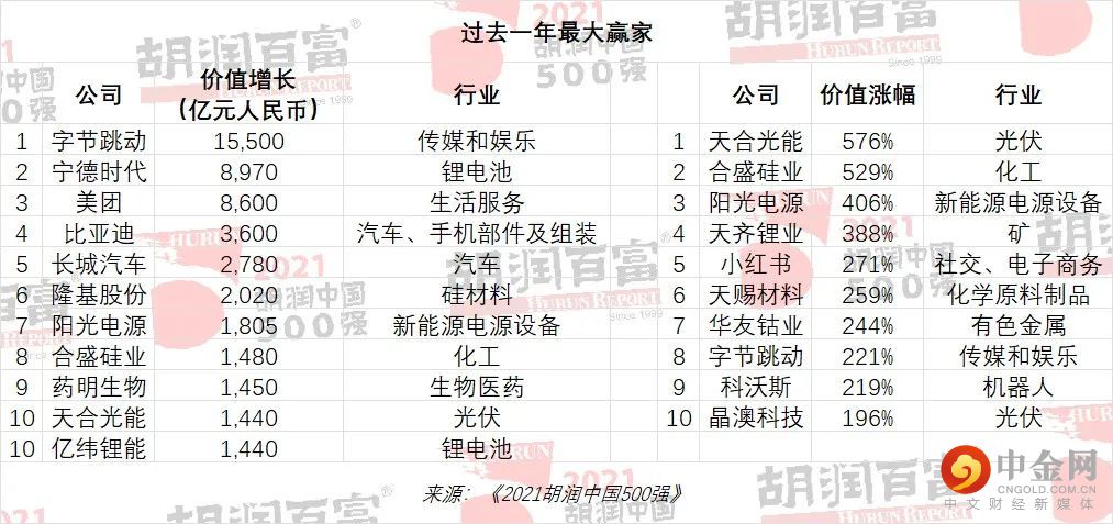 胡润中国500强的总价值比疫情前增长了30万亿,其中以字节跳动、宁德时代和腾讯为首的前十家增长最多的公司一共增长了7.6万亿,占到四分之一。从涨幅比例来看,新冠疫情爆发以来,这两年价值涨幅最大的前十家公司中,有8家从事新能源相关行业,以主营光伏逆变器等新能源电源设备研发的阳光电源为首,还有4家车企:理想、小鹏、比亚迪和长城,新能源汽车电池供应商宁德时代,锂电原材料供应商赣锋锂业,以及主要从事工业硅及有机硅等硅基新材料产品研发的合盛硅业。