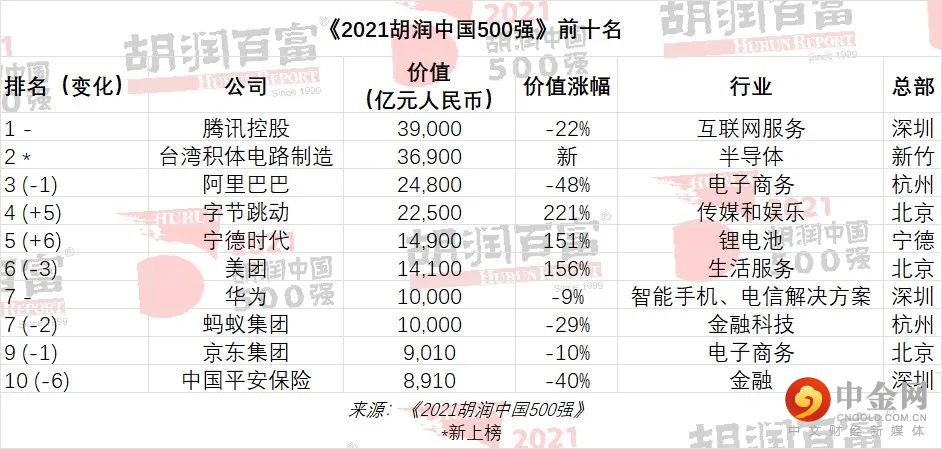 1月19日,胡润研究院发布《2021胡润中国500强》,列出了中国500强非国有企业,按照企业市值或估值进行排名。34家企业价值涨了一倍以上,3家企业价值涨了上千亿美金,以字节跳动为首,其次是宁德时代(300750.SZ)和美团(03690)。腾讯(00700)仍以3.9万亿元蝉联中国价值最高的非国有企业,台积电(TSM.US)以3.7万亿元价值排名第二,阿里巴巴(09988)价值跌去一半至2.5万亿元,排名下降一位至第三。