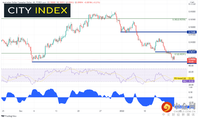 巧合的是,240分钟时间轴上,10年期美债收益率与澳元/加元之间的相关系数也是-0.93!因此,短线负相关性同样强烈。这意味着如果收益率继续走高,澳元/加元应会进一步下挫。跌破0.8972可能触发止损。支撑位一直要下看前述时间轴内61.8%回档0.8810。水平阻力落在0.9037、0.9100和0.9159。如若10年期美债收益率走低,且/或汇价紧随RSI反弹,澳元/加元跌势有望于上述任一水平暂停。