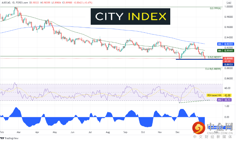 这和澳元/加元有什么关系?日线图上,澳元/加元目前与10年期美债收益率呈强烈负相关。当前相关系数-0.93。相关系数高于+0.80或低于-0.80则视为两种资产之间存在强相关性。-1.00则指向完全负相关,意味着两种资产所有时候都呈反向走势。-0.93已经非常接近这个读数了! 10年期美债收益率突破2020年2月低点至2021年1月高点上行之50%回档位,澳元/加元也同时下穿2020年2月高点至2021年2月低点下行之50%回档位。此外,货币对目前距2021年12月低点仅数点之遥。但请注意,RSI正与汇价走势构筑背离,表明货币对可能做好了反弹准备。澳元/加元会继续推低吗?