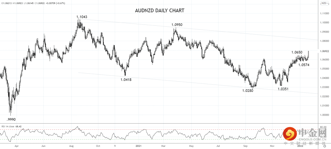 基于上述预期,我们可以利用汇价回落至1.0665/45时开立澳元/纽元多仓,目标是在1.0800/20价位了结获利。止损应设在2022年区间低点1.0565下方。