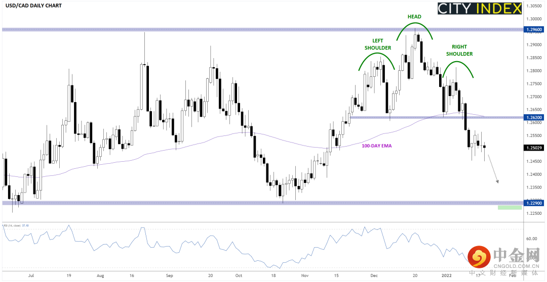 该北美货币对技术面下破头肩顶形态的颈线1.2620,确认了此形态成立,也符合我的同事Joe Perry上周做出的预期。按该形态高度(即340点子)衡量的下跌目标在6月-10月前支撑1.2290区域: