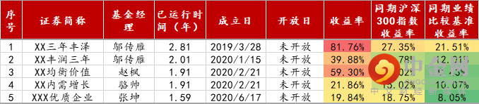如下图所示,有的定开基金发行时间较晚,仍处于锁定期内,我们也统计了5只尚未到期的定开基金,它们全部取得正收益,截至最新的收益率介于19.84%至81.76%之间,全部同时跑赢了沪深300指数和对应的业绩比较基准。