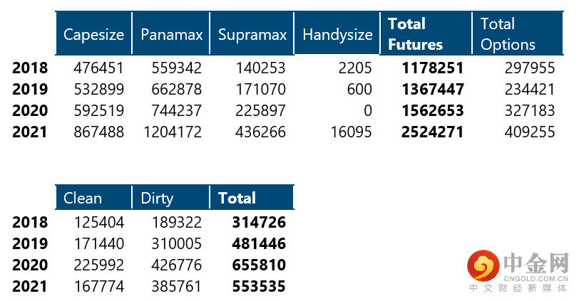 干散远期运费协议(FFA) 成交量达2,524,271手,较2020年增长了61%。干散市场期权交易创下了409,255手的历史新高,与上一年度相比上涨25%。2021年成交量最大的合同是根据波交所巴拿马型船舶期租租金签订的,成交量达1,202,432手。