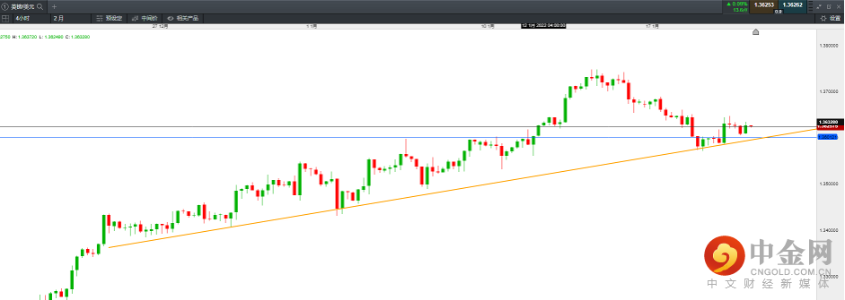 英镑在回撤至1.357后成功支撑企稳,这一位置也是4小时图的上行趋势支撑处。因此价格有望进一步上行。