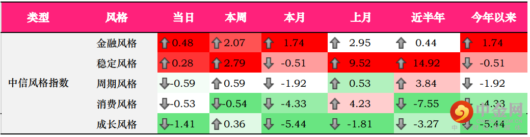 中信风格方面,金融风格、稳定风格表现较好,涨幅分别为0.48%、0.28%。我们在上一次报告中已经提到。MLF的调降的直接受益方则是银行,房地产也会因降息催化下,销售有一定的增加。万科A、大龙地产、金科股份、阳光城均现涨幅。相比之下,成长风格表现较差,当日下跌1.41%。