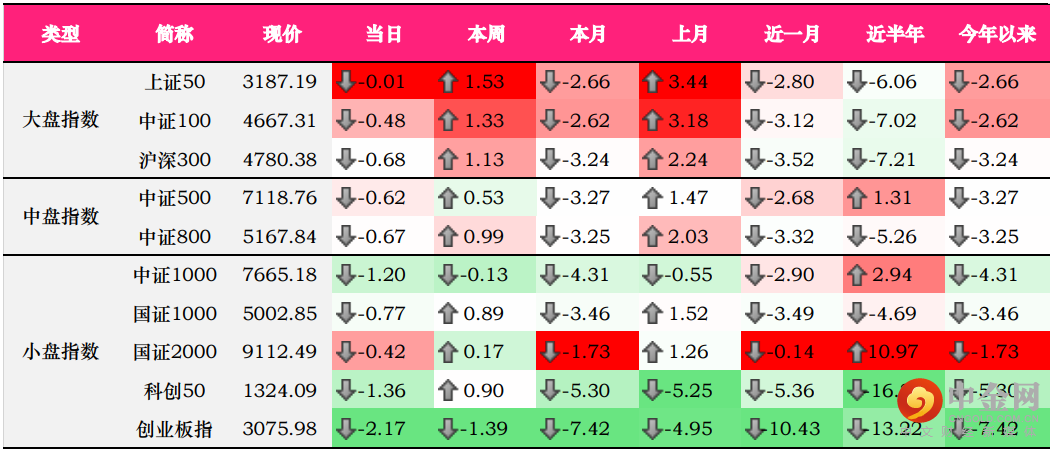 大、中、小盘指数方面,创业板指持续下跌,当日跌幅超2%,收于3075.98点;大盘指数表现相对中小盘来说较好,但也出现小幅下跌;其中,上证50下跌0.01%,报3187.19点,中证100下跌0.48%,报4667.31点。