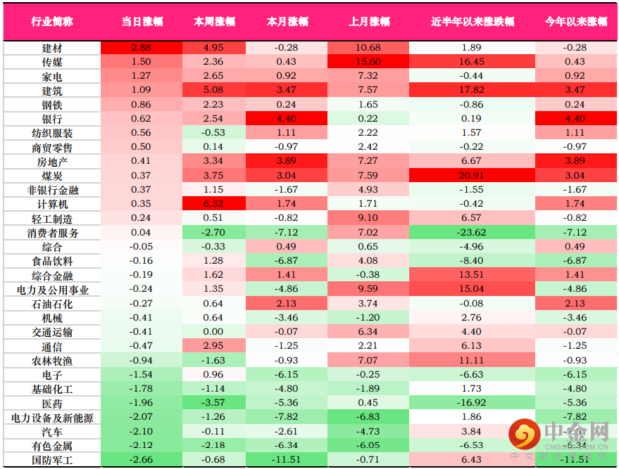昨日,涨幅前三的中信一级行业为:建材(2.88%)、传媒(1.50%)、家电(1.27%);跌幅前三的行业为:国防军工(2.66%)、有色金属(2.12%)、汽车(2.10%)。