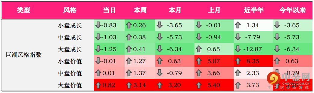 巨潮风格指数方面,价值、成长持续上一日的分化行情;其中,大盘价值涨0.82%,本周涨幅已扩大至3.14%;大盘成长则下跌1.25%。大、小盘方面,大盘风格短期内占据上风。