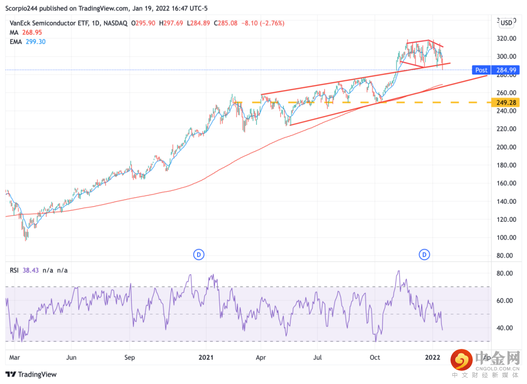 半导体指数基金今日大跌,跌破了去年开始的一个上升趋势线。设想下如果这被证明是上升楔形的大反转的情形。那样的情形将令人惊讶:250美元将是其下跌途中的一个支撑线。
