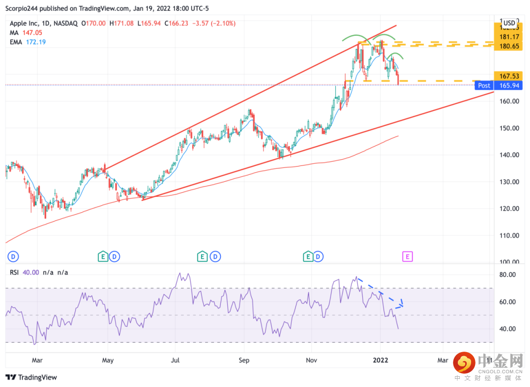 苹果公司的股票看起来已经形成了我在周末提及的头肩形态。就目前而言,该形态已经被确认,不过我们需要看到苹果公司股价进一步下跌以确保无误。150美元处的低点看起来是苹果股价的下一个支撑线。
