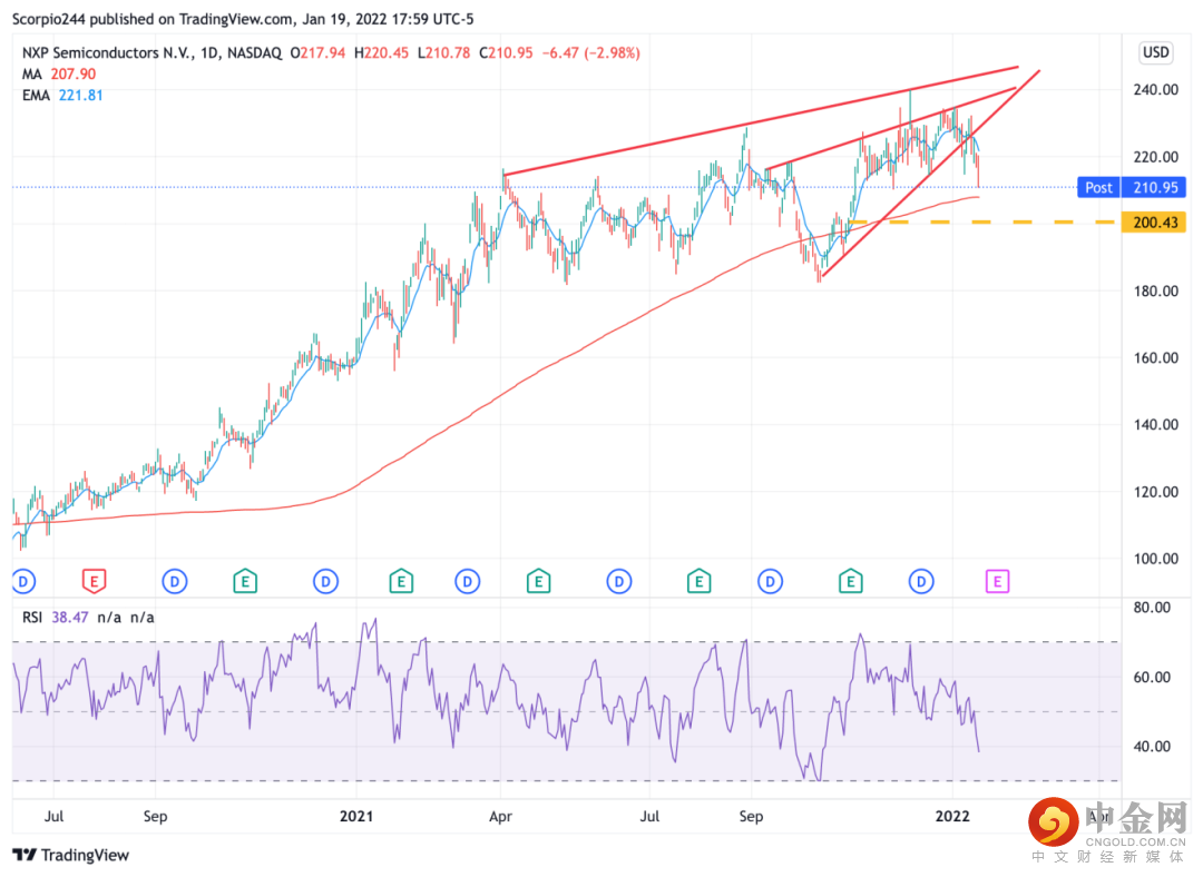 我认为我在近期提到过恩智浦半导体正破位下滑并跌出下降楔形。在200美元处有一个缺口需要填补。
