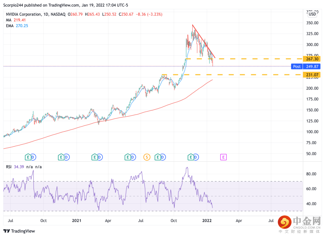 英伟达的股价今天下跌了3%,目前距其高点的跌幅已达27%,并且231美元处的缺口急切地需要被填补。231美元到今天的收盘价250美元仍有8%左右的距离。