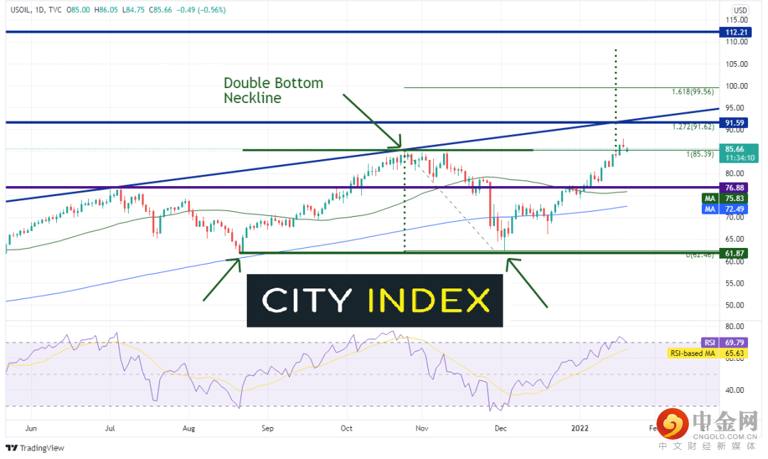 西得州原油和布伦特原油双双创下2014年以来最高点,后市能够在需求旺盛、OPEC+部分成员国供应不力的支持下继续走高吗?从突破双底形态的颈线判断,两者都有机会延续涨势。